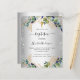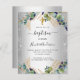 A faux silver looking background decorated with eucalyptus greenery and golden leaves and faux silver glitter sparkles. A golden cross. Personalise and the child's name and ceremony details.