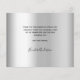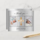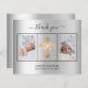Add 3 of Your photos, vertical size, a date, name, and the thank you note. A faux silver looking background with black text and frame. The text: Thank you on the front and your name on the back are written with a stylish hand lettered script with swashes.