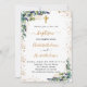 For the baptism of 2 children. A white background decorated with eucalyptus greenery and golden leaves and faux gold glitter dust. Personalise and the children's names and ceremony details. Black and golden coloured letters.