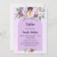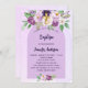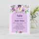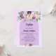 A violet, lavender watercolored background. Decorated with violet and purple watercolored flowers and a golden cross. Personalise and the name and reception details.