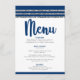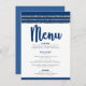 Be proud, rejoice and showcase this milestone of your favourite Bar Mitzvah with a celebration to be proud of! Tempt your guests with this stunning, modern, party meal menu, featuring navy blue calligraphy script, bold navy blue and soft grey typography, and a navy blue and faux silver glitter striped tallit inspired graphic, all overlaying a simple, white background. His name, date of event, and a white Star of David, over a cornflower blue background, are on the back. Personalise the custom text with all your menu and other information. Guaranteed to add stylish fun to his special occasion!