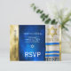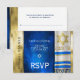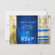 Customise this Bar Mitzvah RSVP with a prayer shawl in blue and gold colours.