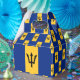 The Barbados flag is a vertical tricolour with in the centre an emblem. The used colours in the flag are blue, yellow, black. The proportion of the Barbados flag is 2:3. The Flag of Barbados was adopted in 1966.