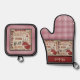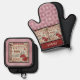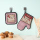 This fun kitchen pot holder and oven mitt set is a wonderful gift for Dad for Father's Day! It features a square with a barbecue grill and condiments in it along with typography including steak, barbecue, tomatoes, lamb, marinade, vegetables and more. Background is red and white gingham check and the top of the oven mitt has a solid red panel with a black border for you to personalise with your Chefs name. There's also two different towels, and a matching apron in our shop to complete the set.