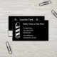 Front: A barber pole is on the left. Next to the barber pole are fields for your text, such as your name, business name, address, phone number, email, and/or website. The text is white and the background is black. A barber pole is on the back.