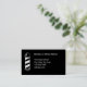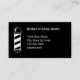 Front: A barber pole is on the left. Next to the barber pole are fields for your text, such as your name, business name, address, phone number, and/or website. The text is white and the background is black. A barber pole is on the back.