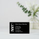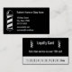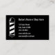 Front: A barber pole is on the left. Next to the barber pole are fields for your text, such as your name, business name, address, phone number, email, and/or website. The text is white and the background is black. A barber pole is on the back.