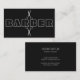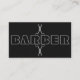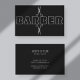 Promote your barbershop with this logo barber business card featuring trendy silver grey modern bold geometric typography script with scissors over a black (changeable) background. +++++++++ Easy to personalise on the backside with your name, title and contact details. ++++++++ Suitable for men salon, self employed barbers, professional barber stylists.