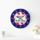 A unique custom wall clock reading Barber Shop in retro script and block letters on a red and white striped background surrounded by white numbers with a thin blue outline on a dark blue face.