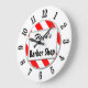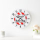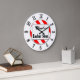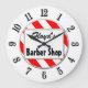 A unique wall clock reading Barber Shop in block letters with room for your name in retro script on a red and white striped background surrounded by black letters on a white face. Click Customise It to change fonts, sizing, background colours and more, even save your design for later.