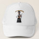 The basketball cap has a sleek and modern design, featuring a structured six-panel construction with a curved brim for a classic sporty look. The front panel prominently displays a high-quality, detailed image of a **cool, handsome barber** against a crisp **white background**. He is wearing a **stylish apron** with **a pair of scissors and two different combs in the pocket**, striking a confident pose. In his hands, he holds **a hairdryer like a gun in one hand and a comb like another weapon in the other**, reinforcing his bold, edgy style.