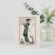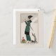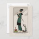 A postcard with the vintage French fashion plate from 1914, Tailleur de Ratine Verte et Veloure Noir, illustrated by George Barbier. This illustration depicts a woman in a green suit with black velvet trim, red flowers, and a small black dog.