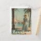 This charming vintage poster captures a stylish woman in a classic 1950s dress walking along Barcelona’s vibrant promenade. Behind her, elegant sailing boats rest gently in the harbour, with the city’s iconic skyline subtly visible. The warm, muted colours and retro textures evoke the lively yet nostalgic atmosphere of mid-century Mediterranean coastal life. Perfect for fans of vintage fashion, seaside scenes, and timeless travel art.