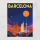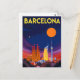 Capture the magical energy of Barcelona at night with this stunning, stylized travel postcard. The vibrant illustration features the city's iconic architecture, including Gaudí's Sagrada Familia and modern skyscrapers, set against a dramatic, starry evening sky and a glowing orange moon. The bold, retro lettering declares "BARCELONA". This card is perfect for those who love Spanish travel, modern art, or collecting unique retro-style posters celebrating the beauty and nightlife of Catalonia.