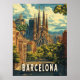 Vibrant, colourful travel poster showcasing the iconic Sagrada Familia in Barcelona. Designed in a flat vector art style with pastel tones and bold colour blocks. Perfect for home décor or travel enthusiasts.