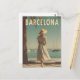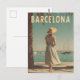 This stylish vintage poster portrays a serene moment at the harbour of Barcelona. A woman in a classic 1950s dress stands near the sailing boats, enjoying the breeze and the view of the sea. The backdrop includes elegant masts, soft waves, and hints of the city's coastal skyline, all rendered in warm retro tones and nostalgic textures. This artwork beautifully captures the charm of mid-century seaside life in Barcelona — perfect for fans of sailing, vintage fashion, and timeless European travel scenes.
