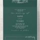 Barn illustration and white text over emerald background. RSVP at bottom with floral border.