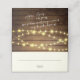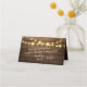 Rustic barn wood and string lights folded seating card with white area for hand writing names and table number and personalised names and message on reverse side.