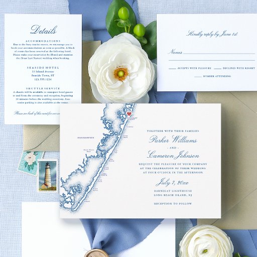 Add a refined coastal touch to your Barnegat Light, NJ celebration with these elegant navy blue Long Beach Island map wedding cocktail napkins. Perfect for cocktail hour, the rehearsal dinner, or your reception bar, they complement seaside venues like Barnegat Lighthouse State Park, Daymark Restaurant, Bonnett Island Estate, and Mallard Island Estate and Yacht Club. A stylish detail for your Jersey Shore wedding with timeless nautical charm. Artwork by Coastal Map Designs
