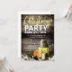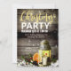 The glowing lantern and string lights on the grey barn wood background creates a warm cosy setting on this festive Christmas party invitation.
