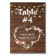 Newlywed names and wedding date in pink floral ribbon heart with glowing light string on rustic barn wood for table number.
