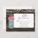 Rustic Barnwood, dangling string lights with pink flowers in a mason jar wedding RSVP. Matching products also available.