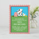 This cute birthday party invitation features a barnyard scene with farm animals on a chequered tablecloth background. Completely customisable.