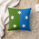 "Per pale vert and azure, five mullets of six points in annulo argent." Populace badge for the Barony of Ayreton in the Society for Creative Anachronism. Back of pillow is a mediaeval pattern in coordinating colours.