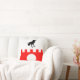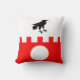 "Per fess embattled argent and gules, in pale a raven, close and sinister facing, sable and a plate argent." Populace badge for the Barony of Raven's Fort in the Society for Creative Anachronism. Back of pillow is a mediaeval-style pattern in coordinating colours.