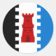 "Per pale sable and azure, on a pale bretassy argent, a tower gules."