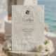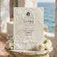 Announce your union with the timeless grandeur of 17th-century art. This design evokes the romance of a European cathedral, perfect for traditional couples.This design features a sophisticated faux bas-relief effect, simulating the look of carved antique stone in a monochromatic palette of warm cream, ivory, and beige. The composition is framed by a classical architectural arch adorned with ornate acanthus scrollwork and roses. At the header, a delicate illustration depicts a Baroque angel playing the violin, flanked by two graceful swans facing one another, symbolising eternal partnership. A subtle bride and groom silhouette icon anchors the text.This is a flat printed image with a visual stone texture effect, not actual raised material or 3D embossing.