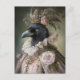 A regal portrait of a raven, centered in the image. The raven is adorned with a gold crown, embellished with pearls, floral motifs, and feathers. It wears a ruffled white lace collar and a patterned gown, with large pink roses and a bejeweled necklace. The raven's black plumage is detailed and realistic, contrasted by its pale, piercing green eyes. Its beak is a dark, elegant grey. The bird is in a three-quarter view, facing slightly left. The background is a soft, muted green, providing a gentle contrast. The composition is reminiscent of a classical portrait, with warm, soft lighting that highlights the textures and details. The overall style is a blend of realism and fantasy, creating an elegant and whimsical atmosphere.