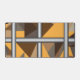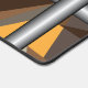 Barred desk mat. Barred is an abstract design created by Vexenwraith and consists of brown, orange, tan, and grey shapes behind silver gradient bars.