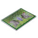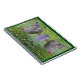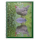 This notebook features a barred rock hen standing on top of a wooden mushroom midst garden flowers and reflections.