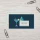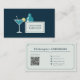 A business card with an illustration of a cocktail shaker and a martini glass on a dark blue background. Perfect for a bartender, a pub, a mixologist or a party barkeeper. On the back, you can find full customisable information and a QR Code.