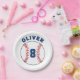 Baseball Ball Bunting Flags Kids Birthday Paper Plates. The design has baseball and bunting flags in red, white and blue colours. Add your name and age.