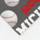 Sports baseball personalised name blanket. This typographical sports-themed patterned blanket has baseballs and little grey, red, mid grey and white text on a dark charcoal grey background. Customise with your own name, currently reads Michael. Other sports balls in this design are available. Designed by www.mylittleeden.com