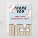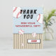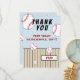 Baseball themed birthday thank you card with thank you message, name and baseball balls. The card is in white, red, blue and black colour scheme. On the back of the card are baseball balls on a blue background. Personalise the card with kids name. You can change or erase the text. Great for kids who love baseball and sport.