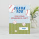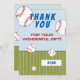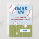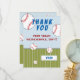 Baseball themed birthday thank you card with thank you message, name and baseball balls. The card is in white, red, blue and green colour scheme. On the back of the card are baseball balls falling on the green grass. Personalise this baseball card with your name. You can change or erase the text. Great for kids who love baseball and sport.