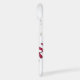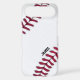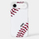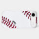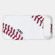 Custom baseball iPhone 6 case, with graphics of the red style stitching of a baseball, in the upper left corner and the lower right corner of the white case. Personalise the black text to suit your needs.