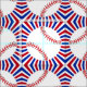 Baseball Design Fabric featuring an image of a baseball on a red, white and blue starburst design background.