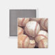 This 2" square magnet has an up close picture of baseballs with the illusion of coloured chalk or dust on them in white.