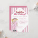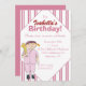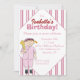 A small girl in a pink baseball uniform and baseball cap stands with bat and ball in hand against a pinstriped background on this birthday party invitation. All text can easily be customised to suit your own needs. From my original digitally-created image.