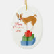 A cute basenji perching on a heap of festive presents makes a perfect ornament for a dog lover, especially someone who knows basenji habits!