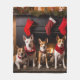 An enchanting scene captures the essence of cosiness and holiday spirit as furry companions adorned in Santa Claus hats gather around a crackling fireplace. The warmth emanating from the hearth creates a snug atmosphere for these adorable canines, while festive stockings hang in the background, enhancing the merry ambiance. The charming illustration portrays a timeless image of companionship and festive joy, perfect for celebrating the holiday season with a touch of canine charm.