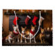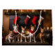 An enchanting scene captures the essence of cosiness and holiday spirit as furry companions adorned in Santa Claus hats gather around a crackling fireplace. The warmth emanating from the hearth creates a snug atmosphere for these adorable canines, while festive stockings hang in the background, enhancing the merry ambiance. The charming illustration portrays a timeless image of companionship and festive joy, perfect for celebrating the holiday season with a touch of canine charm.