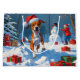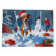 A heartwarming holiday illustration featuring a cheerful dog playing in the snow, wearing a Santa hat and surrounded by colourful gift boxes. In the background, children build a snowman beside a snow-covered Christmas tree, creating a joyful winter wonderland. Perfect for spreading holiday cheer and capturing the magic of Christmas.