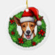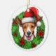 Celebrate the holiday season with our festive Basenji Christmas wreath ornament. This charming ornament features a vibrant illustration of a green Christmas wreath, with the adorable face of a Basenji wearing a cheerful red Santa hat at the centre. Perfect for dog lovers and holiday enthusiasts, this delightful decoration adds a touch of festive cheer to any Christmas tree. Made from high-quality materials, it ensures lasting beauty year after year. Hang it on your tree or gift it to friends and family for a heartwarming holiday surprise.