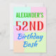 This simple birthday party invitation design features a message like "ALEXANDER’S 52nd Birthday Bash", where the name and birthday number can be customised. It also features a colourful, fun, geometric-themed background. The event details on the back can be customised. It could be used to invite people to somebody’s fifty second birthday celebration or birthday party. [~Z0000311]