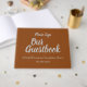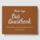 This minimalist event guestbook features the messages "Our Guestbook" and "Please Sign", along with a custom event/occasion date and description. The text is coloured grey, and the background is coloured brown. A generic, customisable guest book such as this might be used at an event such as a family reunion, a retirement party, a baby shower, a wedding anniversary celebration, a birthday party, or some other event.